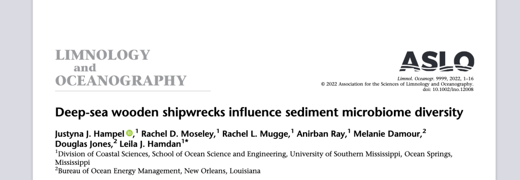 A new paper from the Hamdan Lab was published in Molecular Ecology. “Microbiomes respond predictably to built habitats on the seafloor” was led by Dr. Justyna Hampel with Rachel Moseley and Dr. Leila Hamdan. The study addresses the impact of shipwrecks on surrounding seafloor microbiomes by using 762 deep-sea sediment samples from around nine shipwrecks in the Gulf of Mexico.